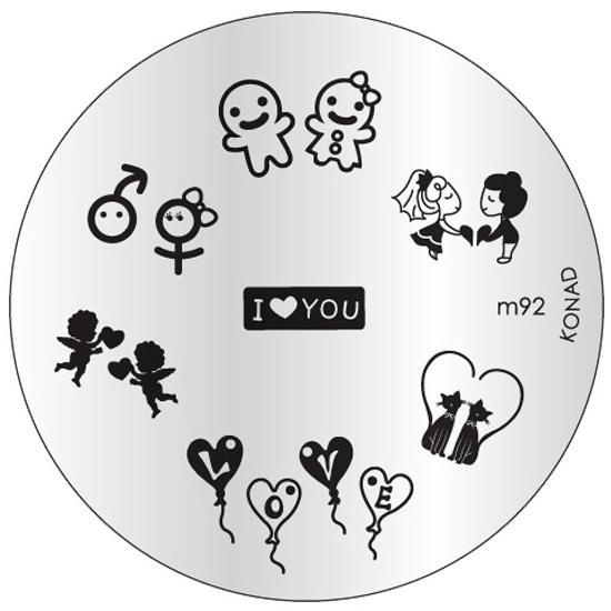 Placa metálica circular para carimbos de unhas com desenhos em preto variados e texto I ♥ YOU