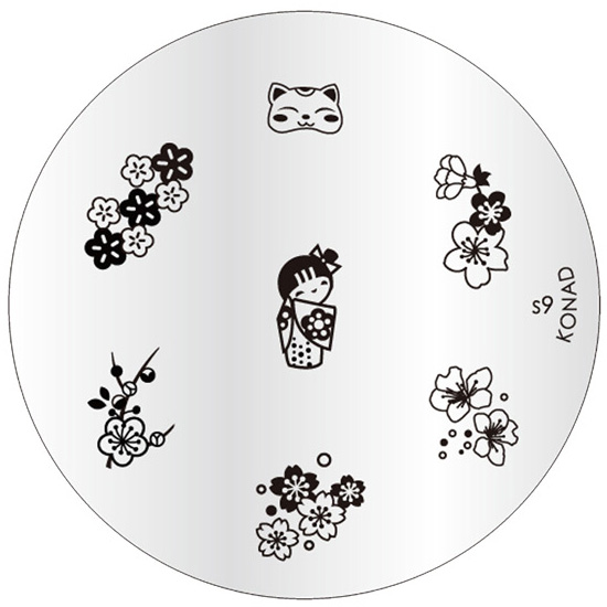 Placa metálica redonda para carimbos de unhas com desenhos de flores, gato e boneca japonesa
