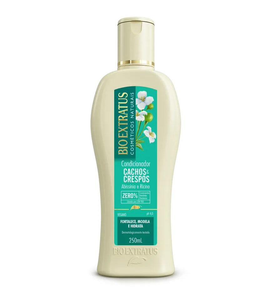 Frasco de condicionador Bio Extratus para cabelos cacheados e crespos, com etiqueta verde e texto visível.