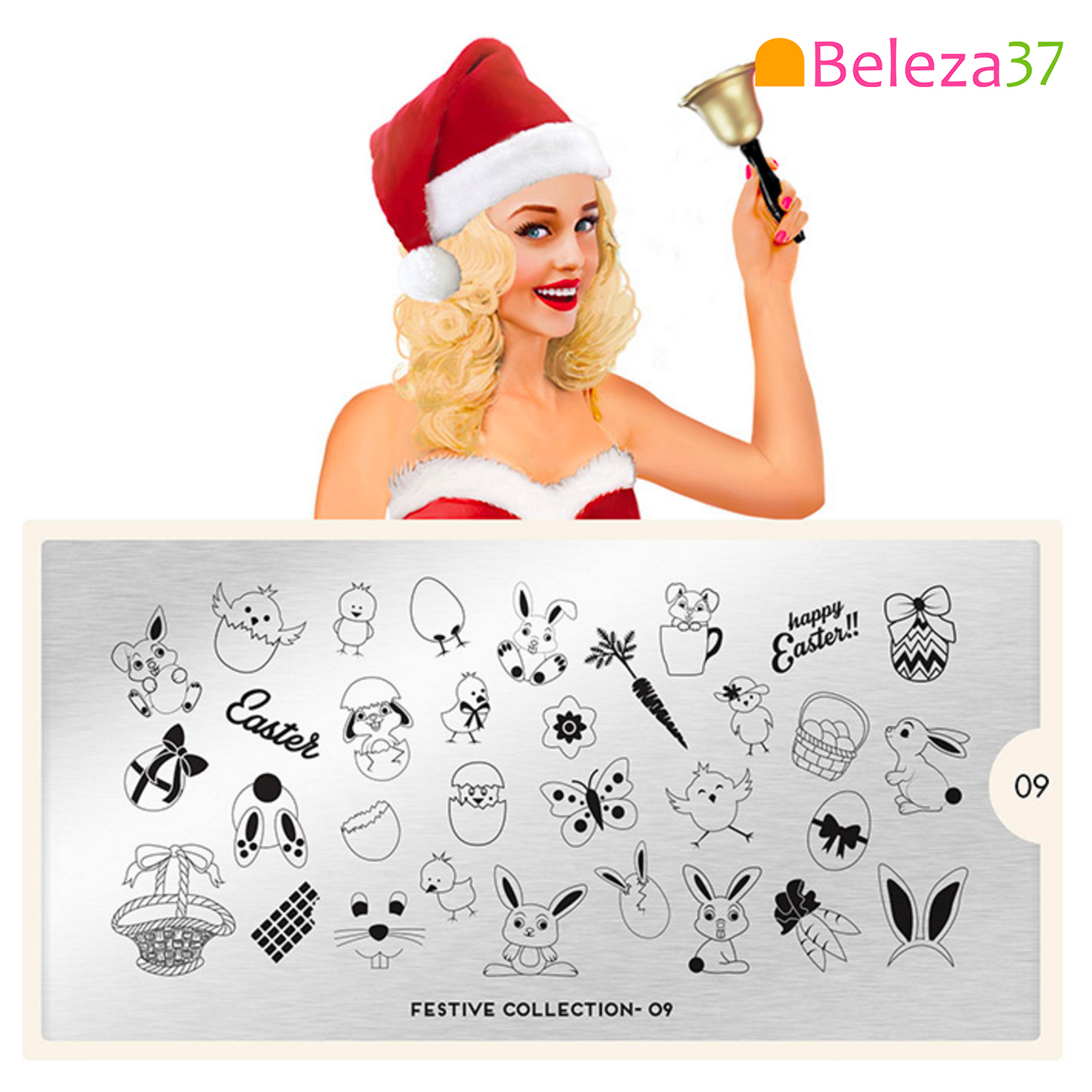 Prancha metálica prateada com desenhos a preto de Páscoa, apresentada por mulher com roupa de Natal