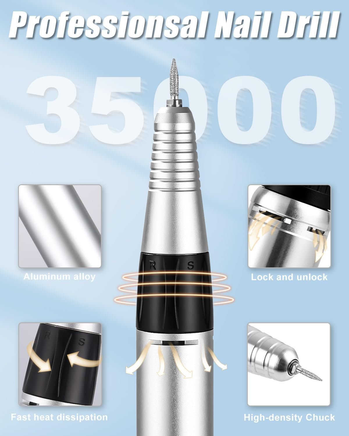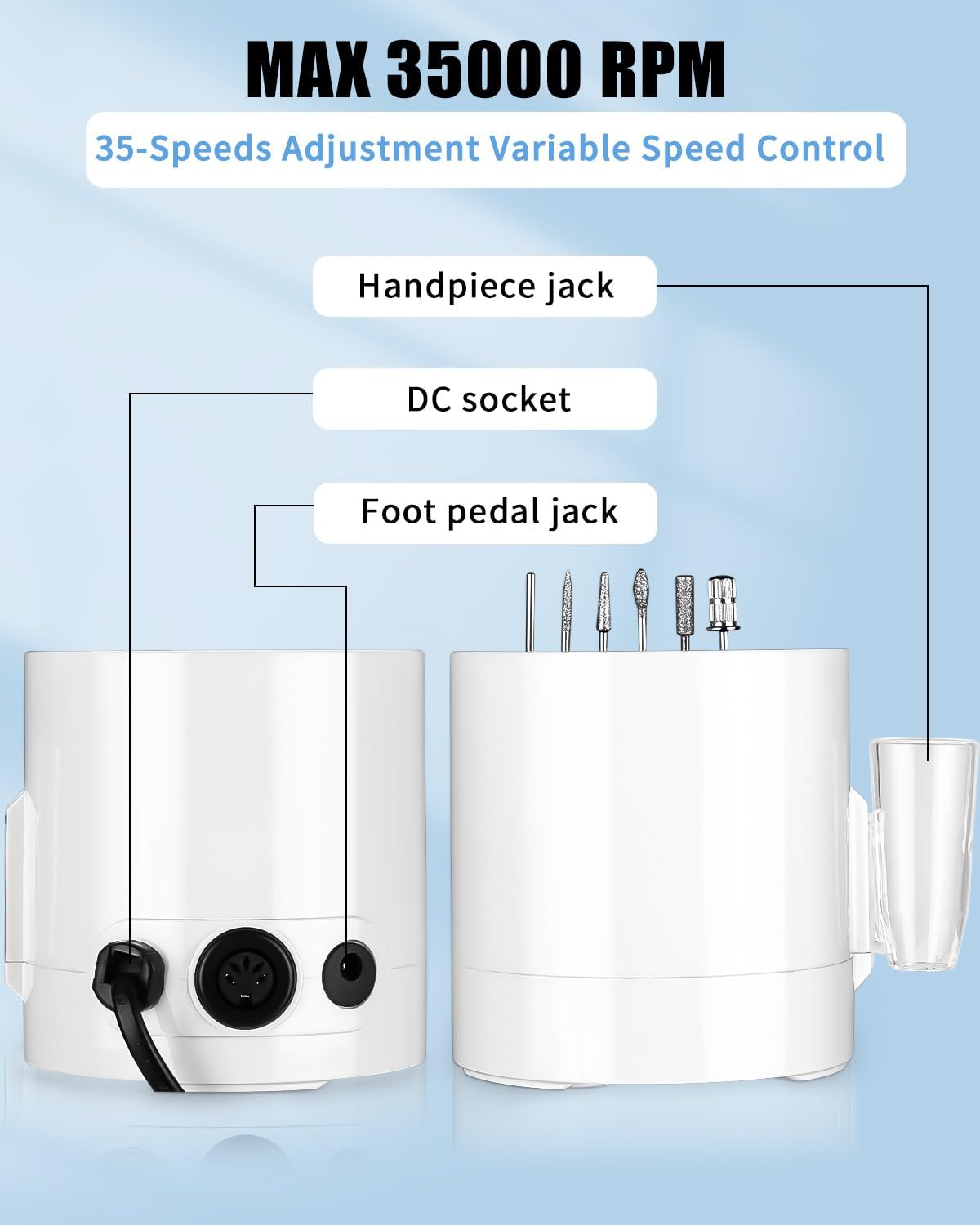 35000 RPM/alta velocidade/baixo ruído: Este torno para unhas é fabricado em liga de alumínio de alta qualidade, com um design de orifícios de ventilação que proporciona excelente dissipação de calor e reduz o risco de sobreaquecimento. Equipado com rolamentos de alta qualidade, funciona suavemente com uma velocidade ajustável de 0-35000 RPM, com baixo calor, baixo ruído e vibração ultrabaixa.