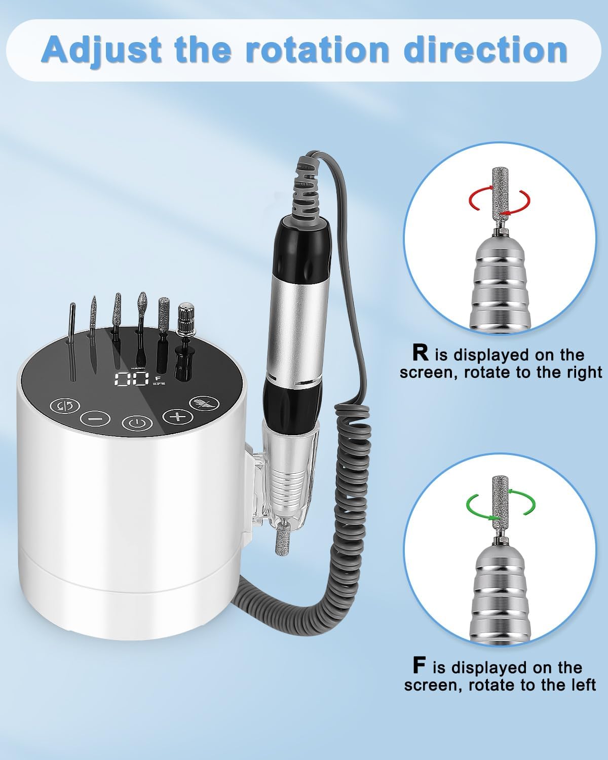 Ecrã LCD / botões táteis: O ecrã LCD do torno para unhas acrílicas mostra a velocidade e a direção, com 35 configurações de velocidade, permitindo que até os principiantes ajustem a velocidade com precisão sem preocupações. Com uma faixa de velocidade de 0 a 35.000 rotações por minuto, é adequado para polir todos os tipos de vernizes de unhas. Os botões sensíveis ao toque são mais estéticos e confortáveis, com maior durabilidade em comparação com os botões de pressão convencionais.