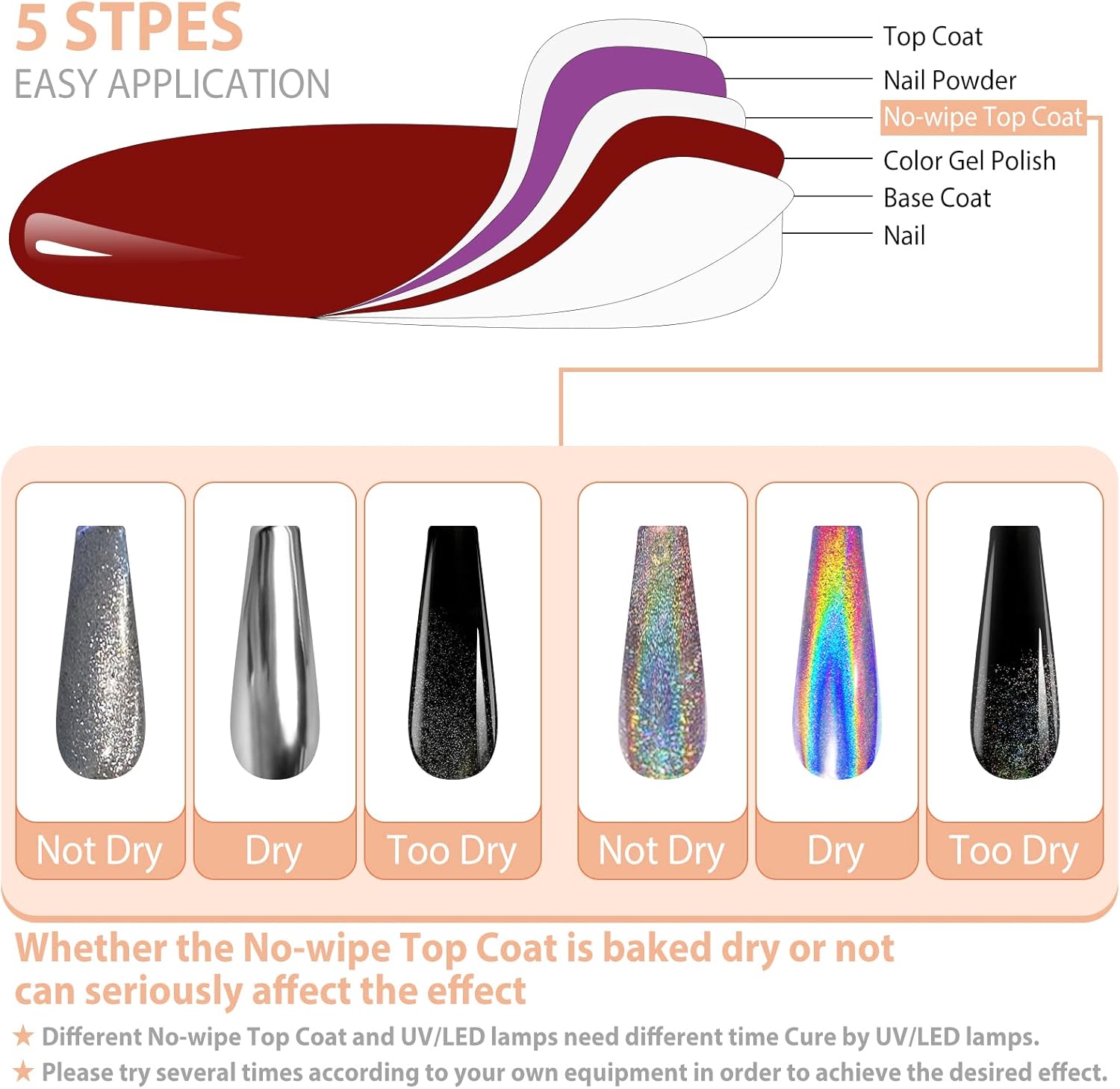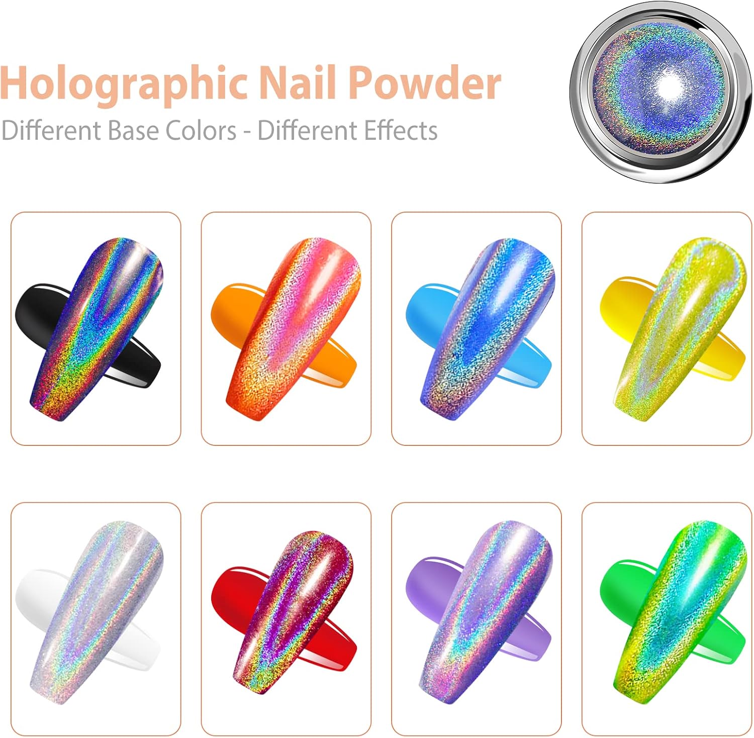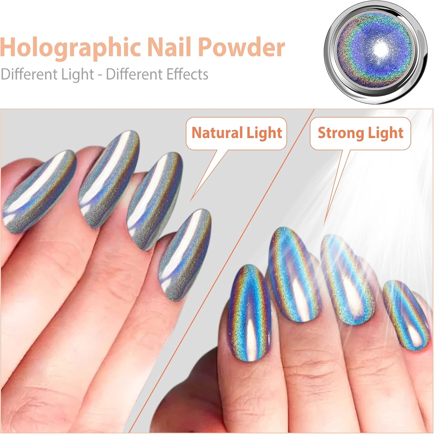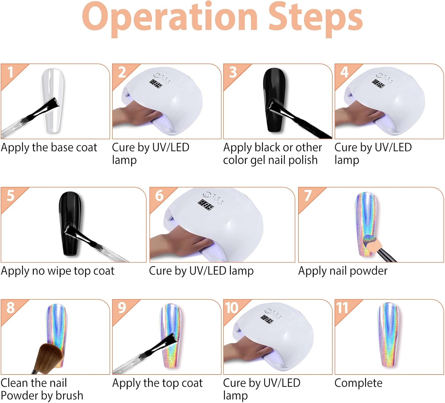Facilidade de uso: O pó de unhas holográfico cromado é simples de aplicar, desde que utilizado corretamente. Este conjunto é ideal para iniciantes, não exige habilidades ou técnicas especiais. Basta seguir as instruções e aperfeiçoar os truques sugeridos. Dica: É necessário utilizar uma camada base e uma camada superior, preferencialmente uma camada superior que não precise ser limpa. Recomenda-se aplicar o pó cromado após a camada superior e finalizar com outra camada superior para garantir que o pó permaneça fixado.
