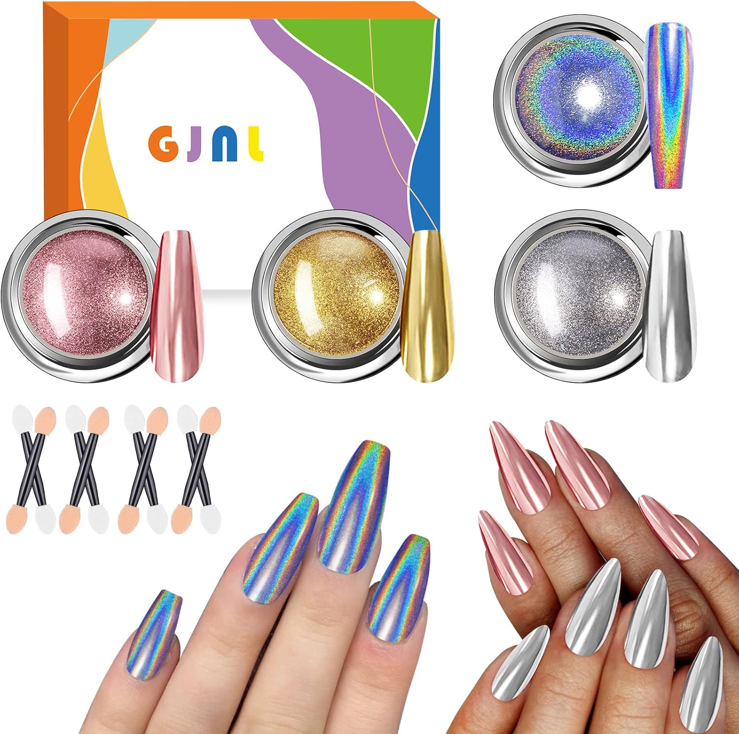 Versatilidade: Este conjunto inclui quatro cores—ouro rosa, ouro, prata e pó holográfico—para atender às suas diferentes necessidades em trabalhos criativos. Os pós podem ser usados em unhas de gel UV, acrílicas, naturais ou artificiais, além de serem misturados com verniz em gel para maior resistência.