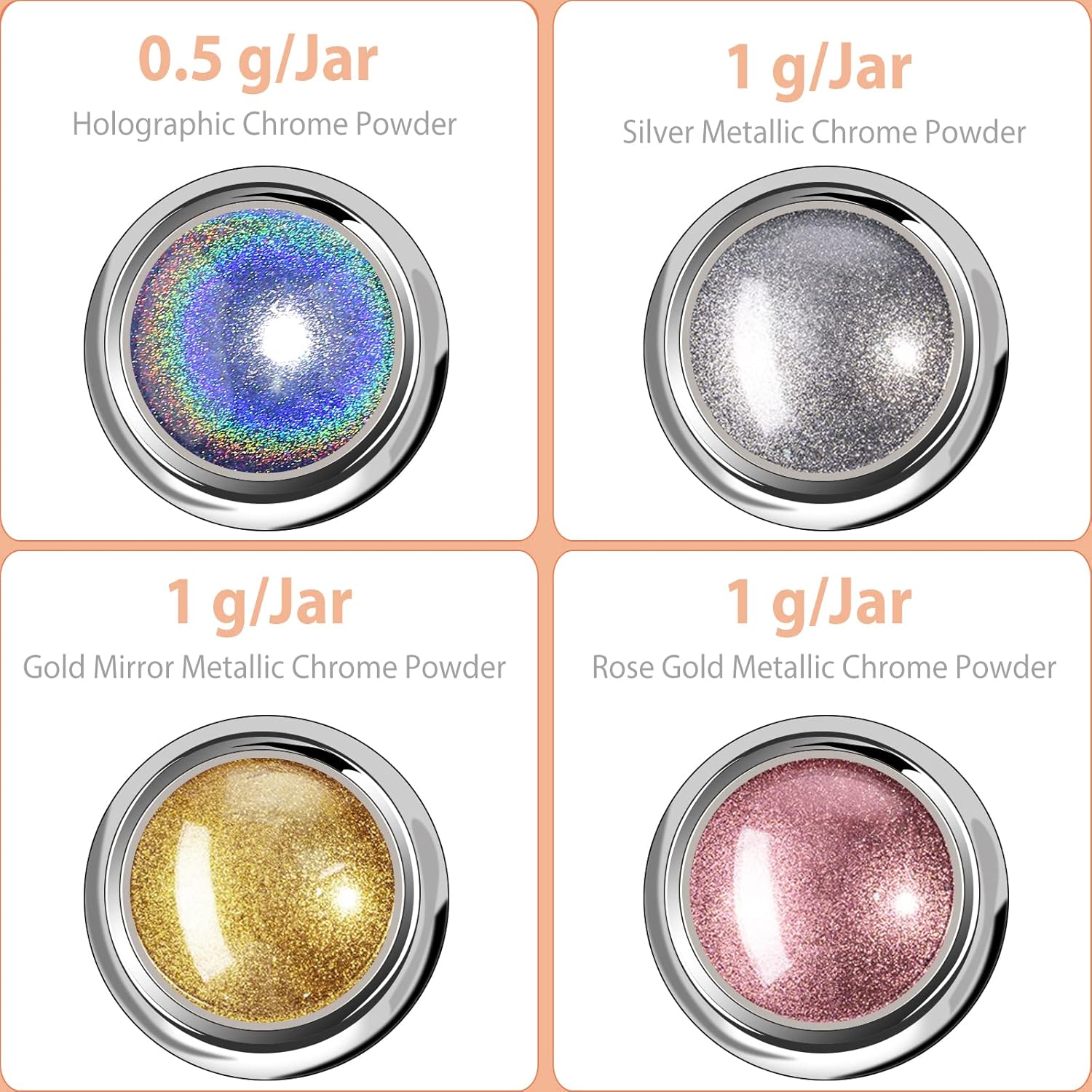 O conjunto de pós cromados para unhas, contém 0,5 g por frasco de pó holográfico, 1 g por frasco de pó com efeito espelho prateado, 1 g por frasco de pó com efeito espelho dourado, 1 g por frasco de pó com efeito espelho de ouro rosa, além de 4 barras de esponja. Este conjunto de pó cromado oferece 4 cores.