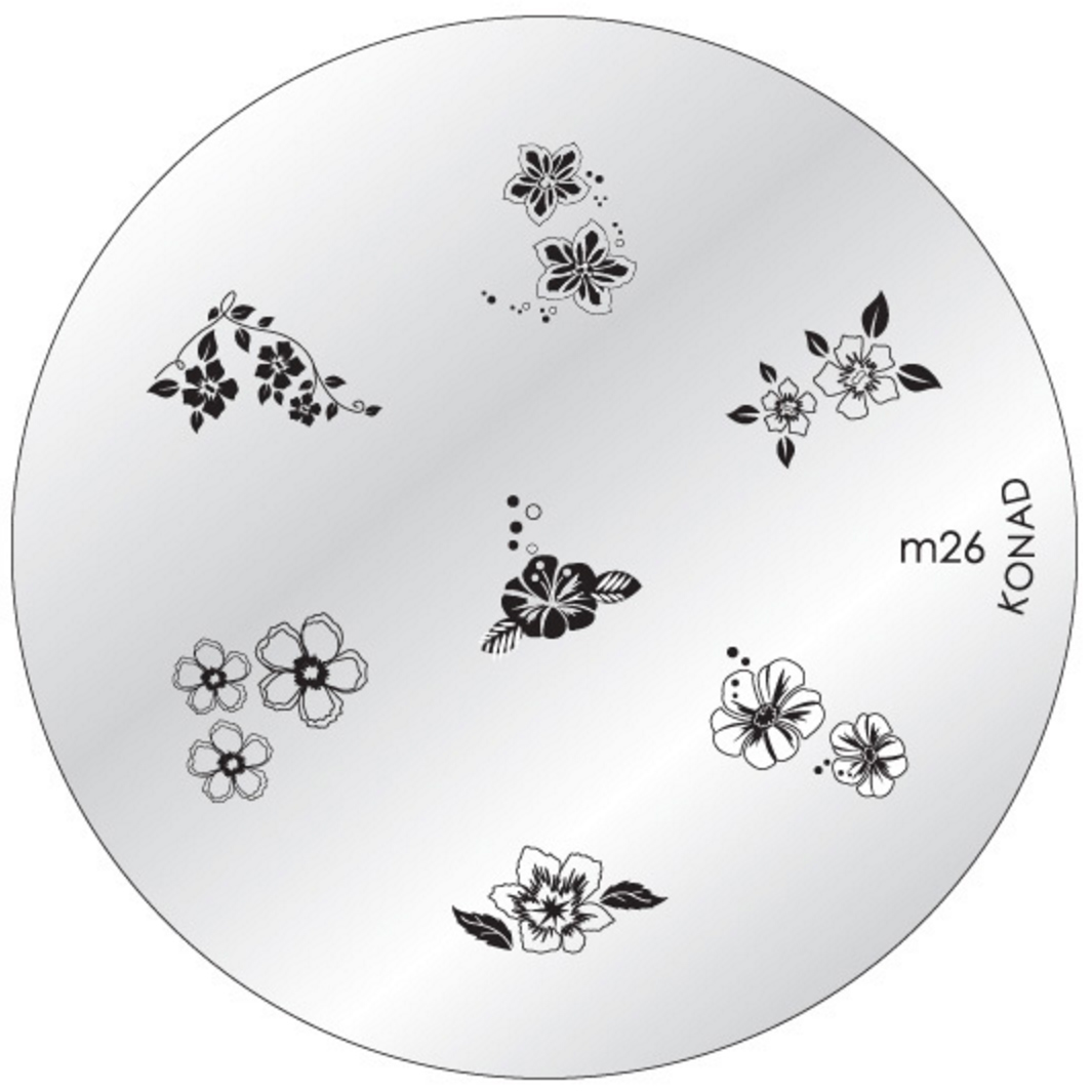 Disco metálico prateado redondo com desenhos florais pretos e texto KONAD m26