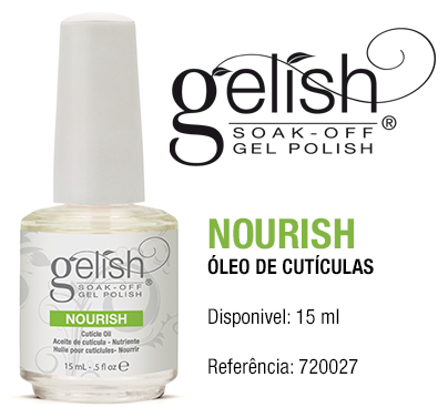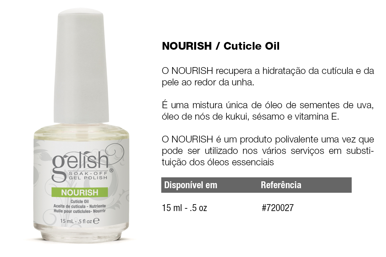 Nourish recupera a hidratação da cutícula e da pele ao redor da unha. Nourish é uma mescla única de óleo de semente de uva, óleo de nozes de kukui, gergelim e vitamina E.