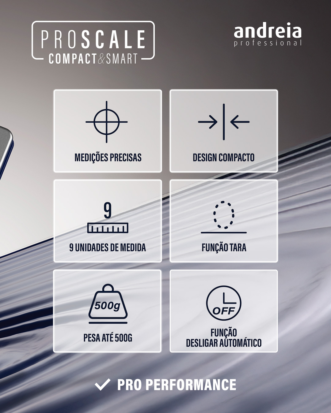 Compacta, moderna e intuitiva, a Pro Scale - Compact & Smart com a plataforma em aço inoxidável durável e fácil de limpar garante medições rigorosas de cosméticos capilares e de beleza, integrando funções inteligentes para um trabalho rápido e exato.