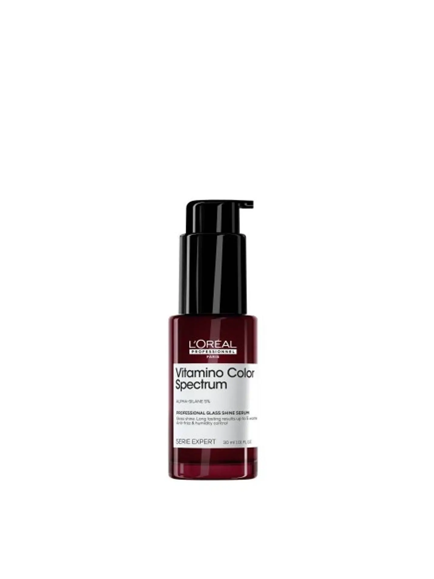 Descobre o sérum de brilho Vitamino Color Spectrum de L'Oréal Professionnel. Este sérum profissional é desenvolvido para proporcionar um brilho cristalino instantâneo ao cabelo com coloração. Formulado com 5% de alfa-silano, reveste a fibra capilar para proporcionar uma proteção antifrizz e protege o cabelo da humidade e calor até 230 ºC*.