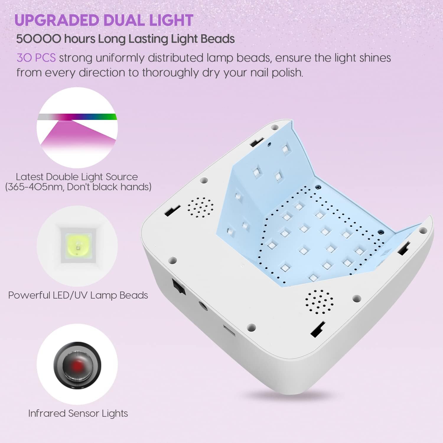Fonte de luz melhorada: O catalisador de unhas ANBEISTEE vem com 30 fontes de luz dupla, que brilham de todas as direções e secam o verniz de unhas rapidamente. A luz é suave (395 - 405 nm).